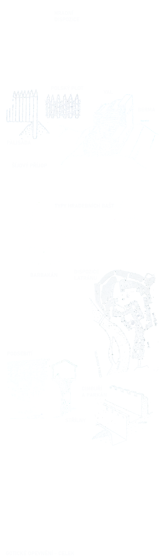 Střílny postupně nahradily "děravé" cimbuří. Hlavními typy byly štěrbinové (prostý obdélník, uzaviratelná), klíčová (klíčová dírka otočena o 180°) a křížová, kde přibyl v horní části kříž na míření. Ta se také v renesanci používala dekorativně. Potom byly rozšířené střílny dělové.