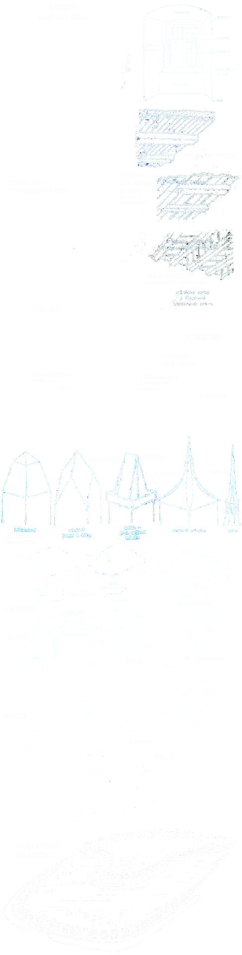 Stropy se řešili různými způsoby. U prostých stavení to byl povalový strop z kmenů kladených přes nosné trámy. Trámový záklopový strop býval tvořen trámy přes něž byla kladena prkna (záklopy) a byl malířsky dekorovaný nebo napouštěný býčí krví. Takové stropy byly často podbity prkny, a tak se dochovalo mnoho mnoho starobylých stropů zcela skrytě. Bohatšími stropy byly kazetové (kazetování) nebo táflované - tzn. obkládané dřevěnými dekorovanými deskami (i stěny).
