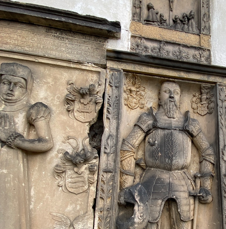 Renesance si ukousla na celkovém vyznění kostela o něco větší kousek v podobě kamenných náhrobků vložených ve zdivu kostela dychtících po citlivé restauraci.