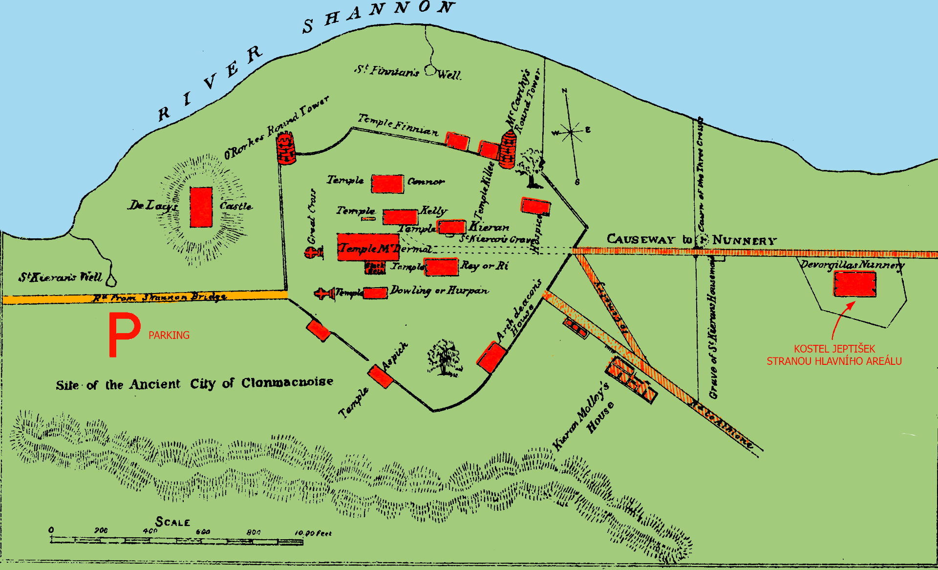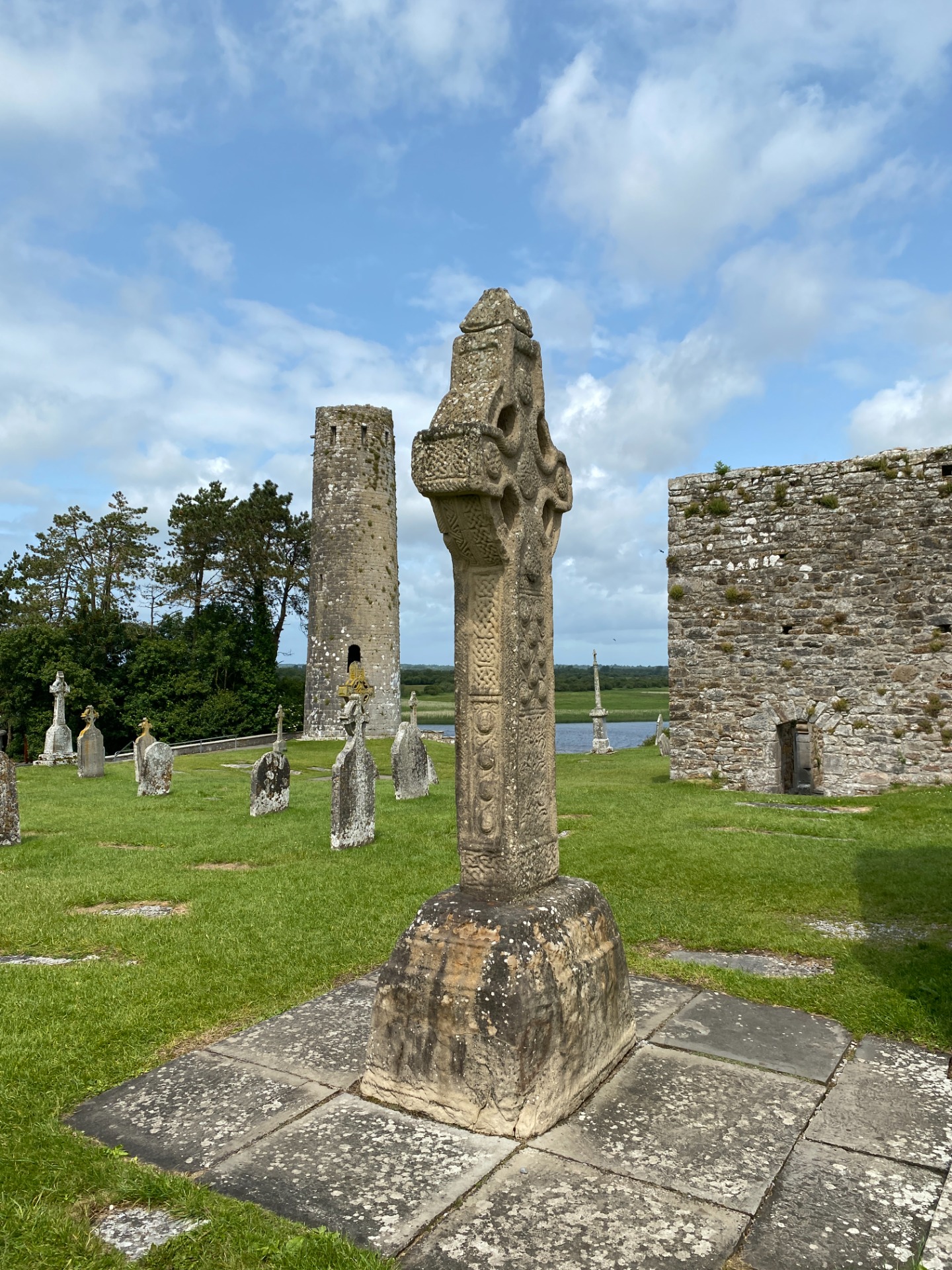Clonmacnoise je jedno z nejdůležitějších náboženských míst v Irsku od protokřesťanské doby až po vrcholný středověk. Podle toho vypadalo plné parkoviště a hned několik autobusů. Přesto, díky velké rozloze, na které jsou ruiny vyskládané a otevřené pláni k řee Shannon, nebyl cítit úplný "overturismus". Ba naopak pán na pokladně si na nás udělal čas a při legitimizaci heritage kartou irské organizace OPW spravující památky opáčil "lovely". Následně se vytasil s českými texty, a tak jsme se dozvěděli o místě přímo z materiálů muzea. K pokladně přiléhá modernější expozice o historii kláštera, je tu hodně informací, ale projít si ji doporučujeme. Je zpracovaná hezky a navíc jsou tu originály vysokých křížů, jejichž kopie stojí venku na původních místech. Ani z venku budovy muzea příliš kolorit neruší. Doporučujeme neopominout torzo románského kostelíka ("kostel jeptišek"), který není přímo v areálu (viz mapka), ale nachází se pár set metrů od hlavních budov. Stačí na konci areálu otevřít branku, projít po asfaltce ke hřbitovu a ejhle - možná má větší atmosféru, i tím že tu nikdo není. Vrátit se můžete úplně v klidu. Místní pracovníci jsou pohodáři a mají přehled. Stejně jsme se před vycházkou zdvořile zeptali.